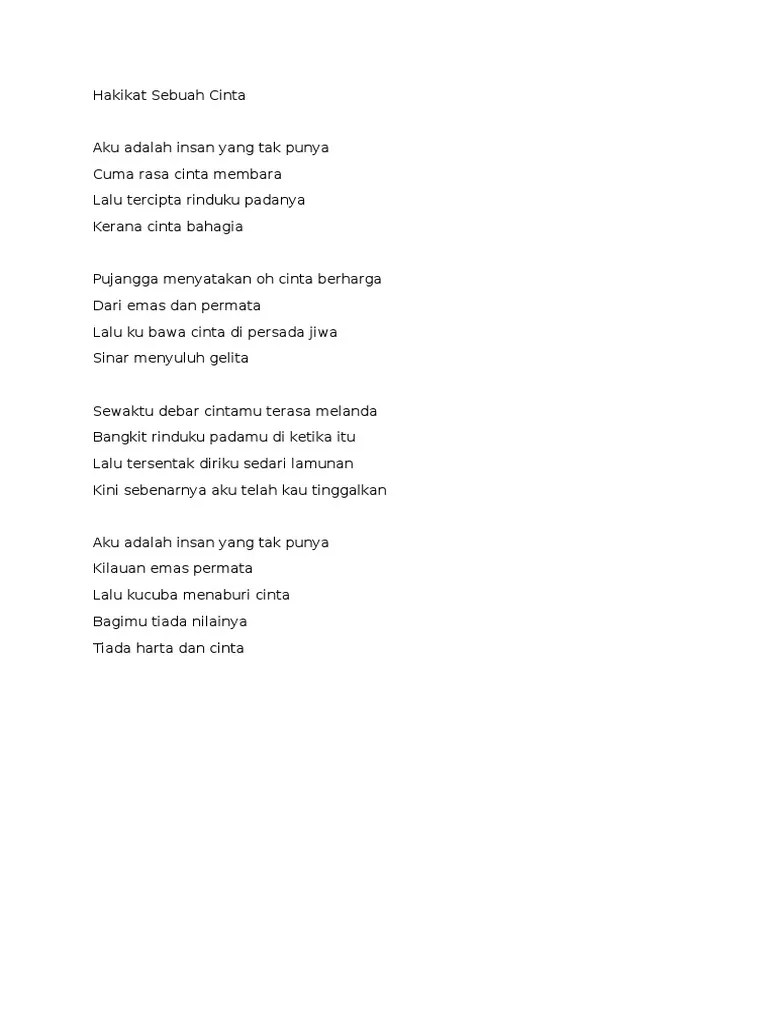 Am f g c pujangga menyatakan oh cinta berharga f dm e dari emas dan permata am f g c lalu ku bawa cinta di persada jiwa dm f e sinar. Tebu ireng 04 february 2020. Ada 20 gudang lagu aku adalah insan yang tak punya terbaru, klik salah satu untuk download lagu mudah dan cepat. Aku adalah insan yang tak punya cuma rasa cinta membara lalu tercipta rinduku padanya kera. Aku adalah insan yang tak punya kilauan emas permata lalu kucuba menaburi cinta bagimu tiada nilainya tiada harta dan cinta.