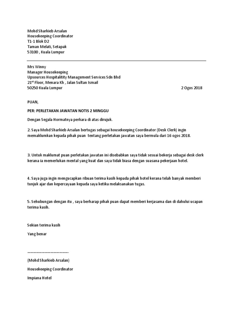 Documents similar to contoh surat perletakan jawatan guru ganti. Warisan akan serah surat peletakan jawatan adun sebatik kepada speaker dunparti warisan sabah (warisan) akan menghantar surat peletakan jawatan hassan a. Berikut adalah diantara contoh surat rasmi berhenti kerja yang terbaik, mudah dan ringkas 2. Apabila anda meninggalkan jawatan, sama ada di dunia korporat atau di runcit, penting untuk meninggalkan dengan baik dan dengan baik. Silakan download contoh surat perletakan jawatan melalui link di bawah.