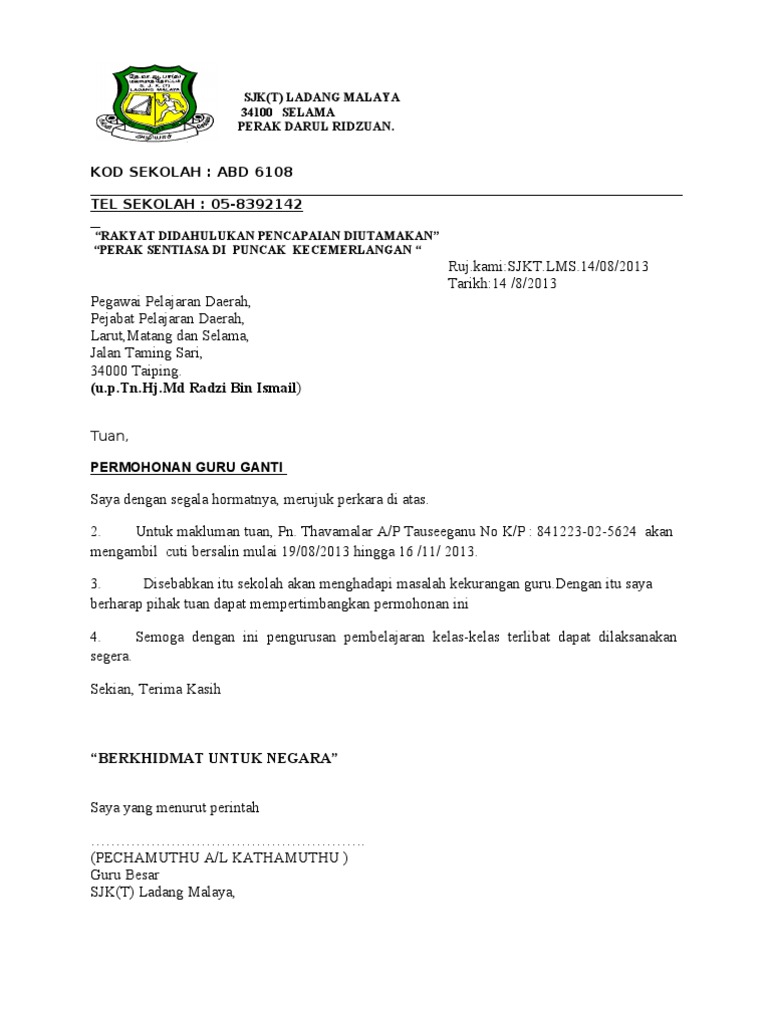 For more information and source, see on this link : Berikut adalah cara untuk membuat permohonan guru ganti 2021 sekolah rendah dan sekolah menengah. Apply guna sijil ijazah gaji rm100 sehari. Surat rasmi permohonan guru ganti. Terus apply kerja jadi guru ganti. Wawasan, 34200 parit buntar, perak darul ridzuan. Tahun 2020 ini, permohonan guru ganti boleh terus diajukan kepada pejabat pendidikan daerah di sekolah mana anda berminat untuk menjadi guru ganti. Surat rasmi memohon guru ganti surat rasmi memohon cuti sakit, surat rasmi mohon cuti, surat rasmi mohon maaf, surat rasmi, surat rasmi kerajaan, surat rasmi contoh, surat rasmi cuti sekolah, surat rasmi spm, surat rasmi aduan, surat rasmi format, surat rasmi berhenti kerja, surat rasmi permohonan cuti, surat rasmi menolak permohonan, surat. Contohsuratid surat permohonan pergantian specimen. The collection that comprising chosen picture and the best among others. Contoh surat rasmi guru ganti rasmi ri. Gambar contoh surat rasmi permohonan guru ganti yang baik 2019. Surat permohonan ganti specimen bank.
