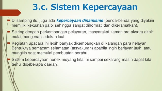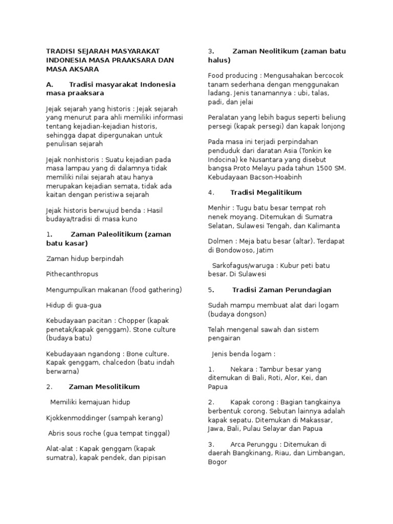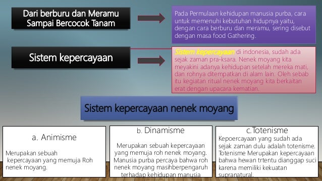 Corak kehidupan masyarakat indonesia pada masa praaksara jejak sejarah foklore Bentuk budaya yang bersifat spiritual dan bersifat material; Masa berburu dan mengumpulkan makanan primer dan masa berburu dan mengumpulkan makanan sekunder. Rusa,kuda,babi hutan,kijang,kerbau,kera,gajah,kudanildan sebagainya perpindahan hewan buruan umumnya dipengaruhi beberapa faktor, diantara nya: Mereka sudah memahami adanya kehidupan setelah mati. Segi kepercayaan ada dinamisme dan animisme; Kehidupan mereka masih bergantung pada alam. Masa prasejarah atau praaksara merupakan masa kehidupan manusia sebelum mengenal tulisan. Penghormatan kepada arwah nenek moyang,menggambarkan binatang buruan,atau binatang yang dianggap suci dan gambar telapak tangan yang berwarna merah (sebagai penolak roh jahat dan upacara kesuburan ). Masa prasejarah atau praaksara merupakan masa kehidupan manusia sebelum mengenal tulisan. Food gathering dan menjadi food producing. Masa berburu dan meramu (food gathering)/mengumpulkan makanan. Sebenarnya nenek moyang kita juga sudah melakukan hal serupa.