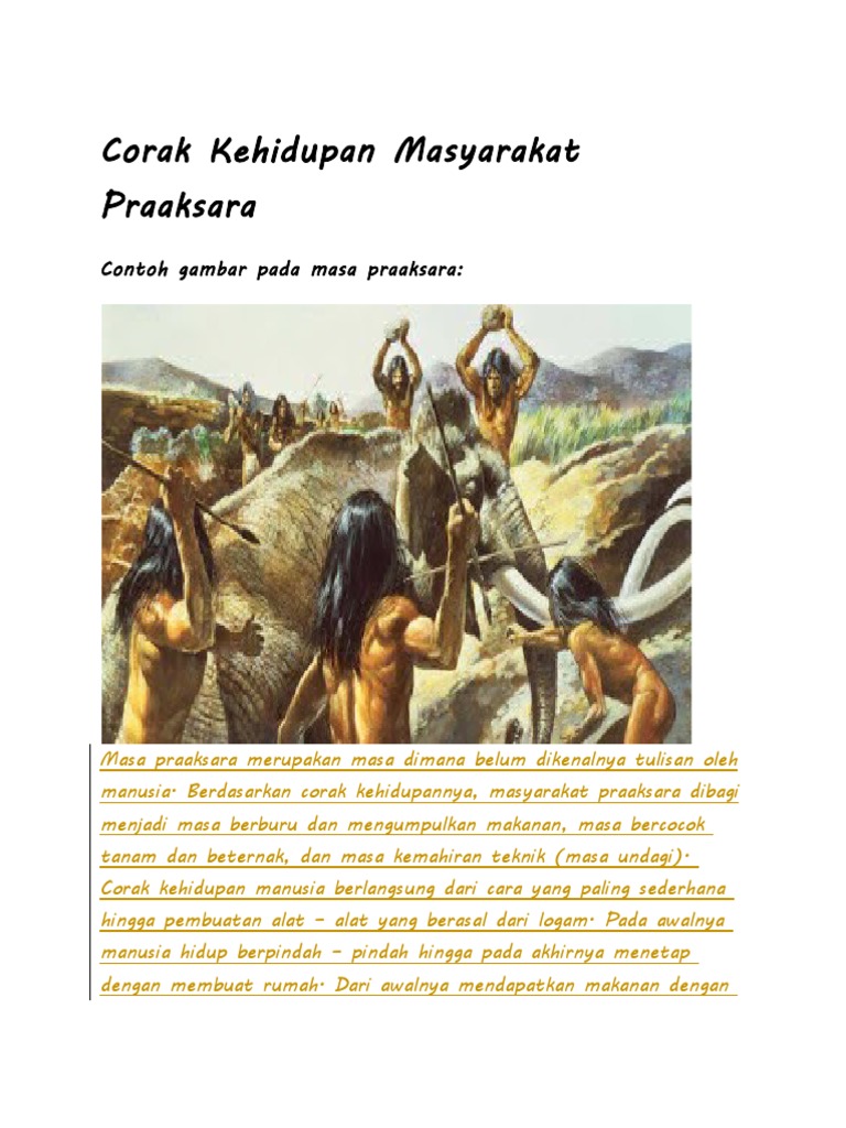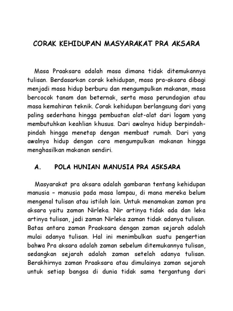 Dalam masa praaksara (prasejarah) indonesia, corak kehidupan dengan cara berburu dan mengumpulkan makanan dibagi menjadi dua masa, yaitu. Kehidupan sosial ekonomi masyarakat praaksara hidup. Kepercayaan pada masyarakat purba dibedakan menjadi animisme, dinamisme dan totemisme. Mereka sudah hidup menetap,sudah ada perkampungan yang dekat dengan mata air,seperti sungai. Dimana daerah yang mereka tempati harus dapat memberikan persediaan yang cukup untuk kelangsungan hidup. Corak kehidupan masyarakat praaksara, pola hunian hingga sistem kepercayaan. Perundagian yang berfungsi sebagai senjata rakyat. Seorang pemimpin yang dipilih itu diharapkan dapat melindungi masyarakat dari gangguan masyarakat luar maupun roh jahat dan dapat mengatur masyarakat dengan baik. Sebelum menjalani kehidupan modern, manusia telah menjalani masa praaksara terlebih dulu. Kehidupan sosial, kebudayaan dan teknologi masa praaksara di indonesia 1. Suatu masa bahwa manusia belum mengenal apa itu tulisan. Masa berburu dan mengumpulkan makanan. Untuk menambah wawasan tentang kehidupan masyarakat dimasa praaksara kami sebagai penyusun/penulis mensarankan kepada pembaca untuk browing di internet karena makalah kami ini menjelaskan singkat saja tentang corak kehidupan masyarakat masa praaksara.