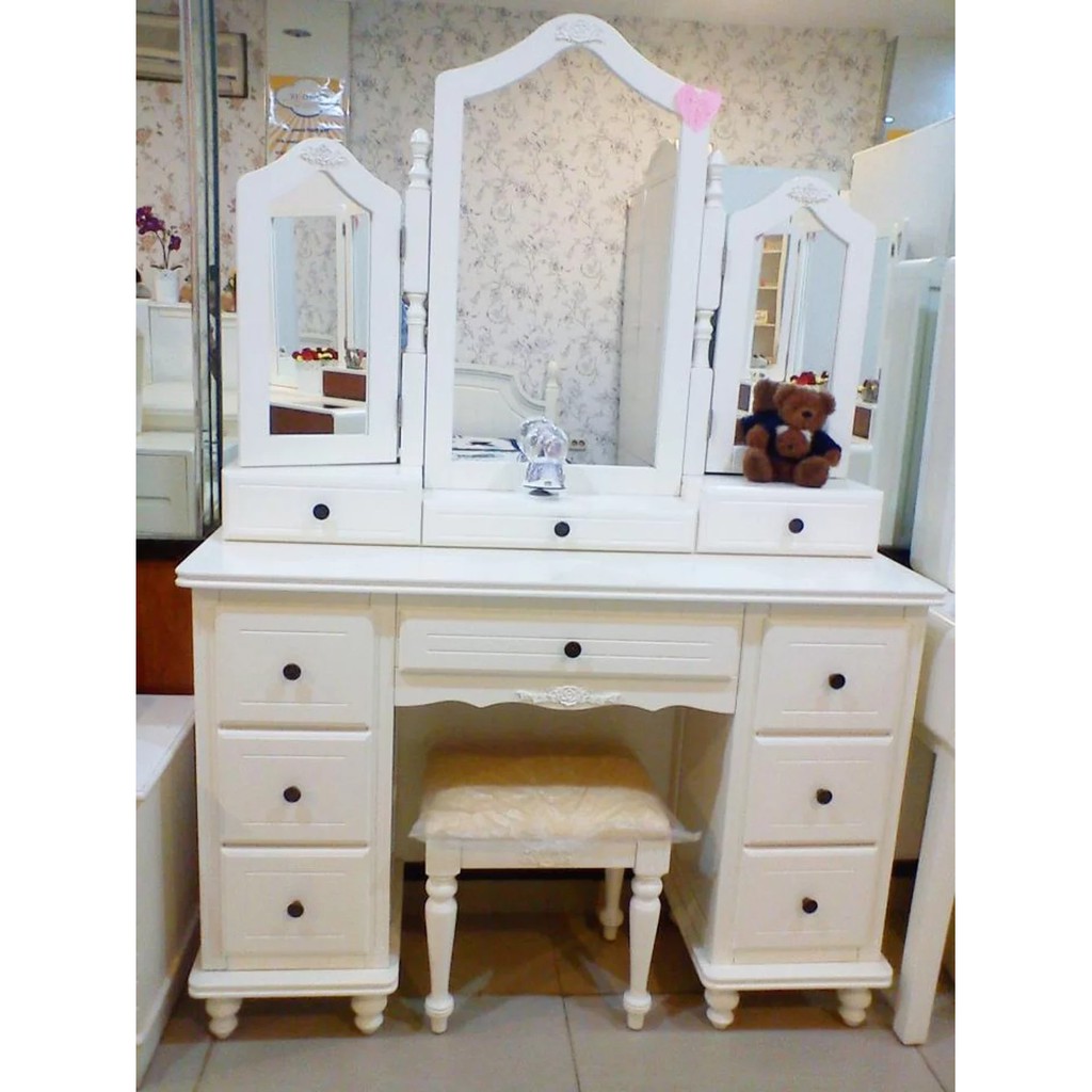 Meja rias duco ukir centrino ini mempunyai model desain furniture klasik modern yang sangat cantik untuk melengkapi kamar tidur anda.dengan bahan kayu mahoni berkualitas akan menjamin ketahanan set meja rias ini. Ketika membeli furniture ini akan berbentuk flatpack dan disertai dengan petunjuk pemasangannya dan harga terbaru tahun ini berkisar rp 1.400.000 ribu. Kalau yang satu ini adalah meja samping yang bisa dijadikan meja rias. Misalnya saja ketika pagi hari sebelum berangkat kerja kita bisa menggunakannya untuk makeup atau hanya sekedar merapikan rambut setelah mandi. Gunakan kursi rias tanpa sandaran untuk memberikan kesan ringan pada tampilan meja rias. Selain itu, meja rias juga bisa digunakan untuk menyimpan berbagai peralatan makeup. Meja rias minimalis ini terbuat dari bahan particle board dengan dimensi 100 x 40 x 133 cm. Untuk yang ingin membeli meja rias, maka sangat disarankan untuk memilih yang sesuai dengan ruangan. Meja rias minimalis modern desain interior rumah impian dengan gaya dekorasi segar dan elegan berbagai gambar katalog online situs kami banyak pilihan sehingga anda tidak perlu bingung mencari produk yang tepat untuk mengisi perabot mebel rumah yang sudah di miliki. Meja juli 01, 2021 14:29. Meja rias ini cukup apik ya dengan bahan dari besi dan kaca. Ukuran :120 x 45 x 75 cm. Produk meja rias terbaik pasti memiliki cermin dan laci penyimpanan kosmetik, sehingga mempermudah anda dalam merias diri.